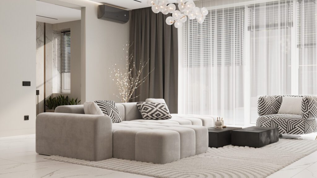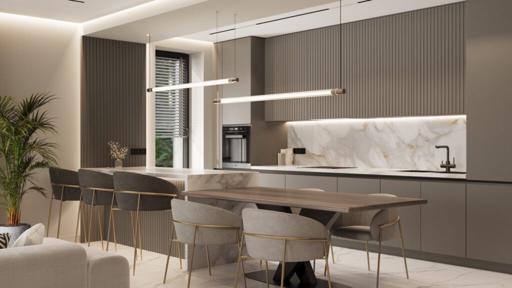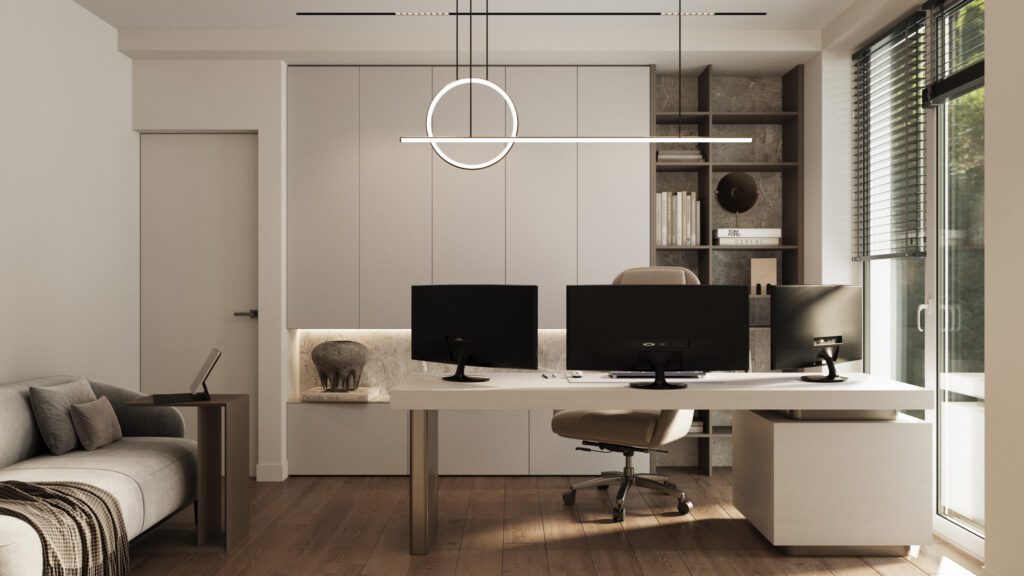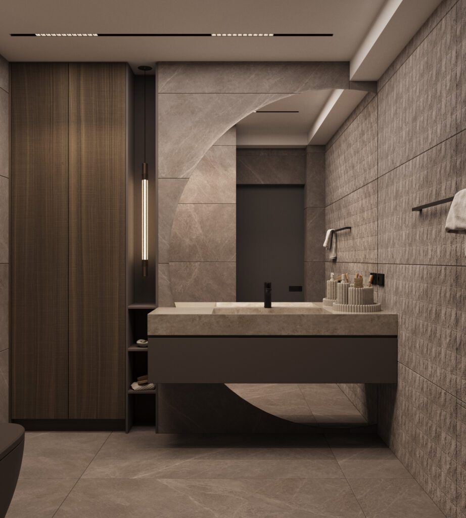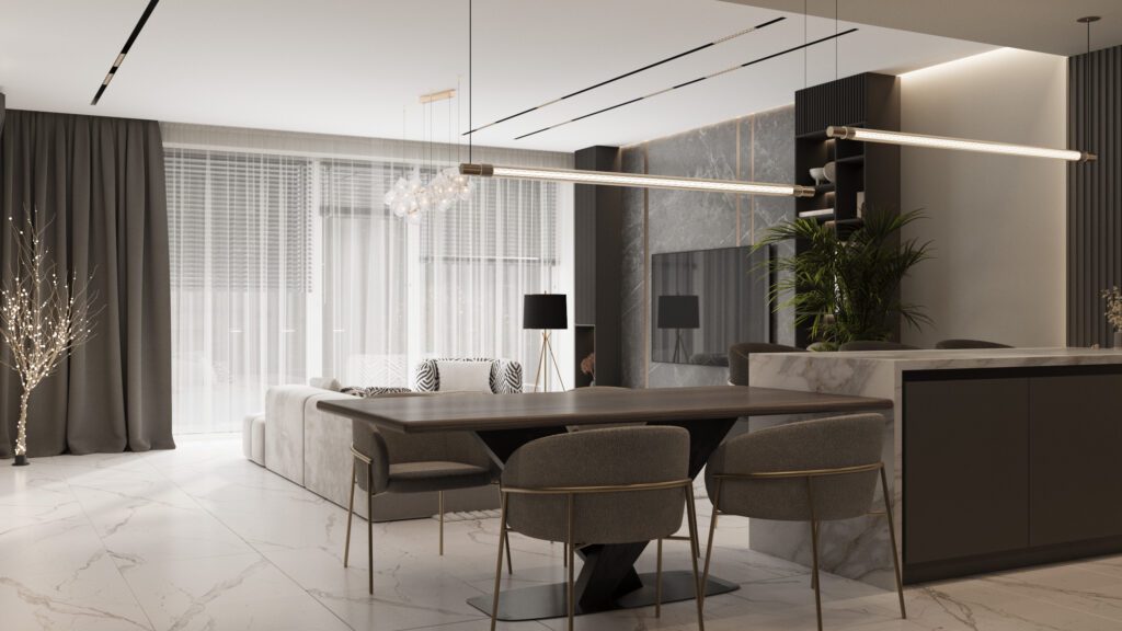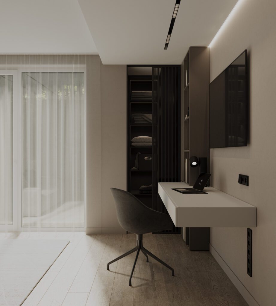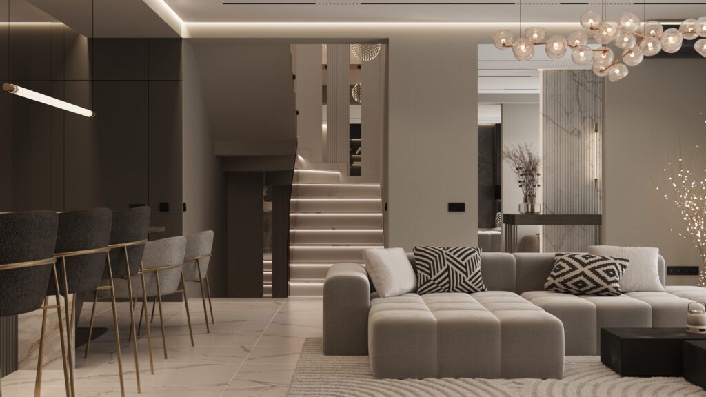 Designul interior folosește o paletă neutră, texturi tactile și corpuri de iluminat sculpturale pentru a crea o atmosferă caldă și sofisticată. Proiectul demonstrează expertiza Irion Company în integrarea funcționalității și esteticului, transformând fiecare metru pătrat într-un spațiu de calitate superioară.