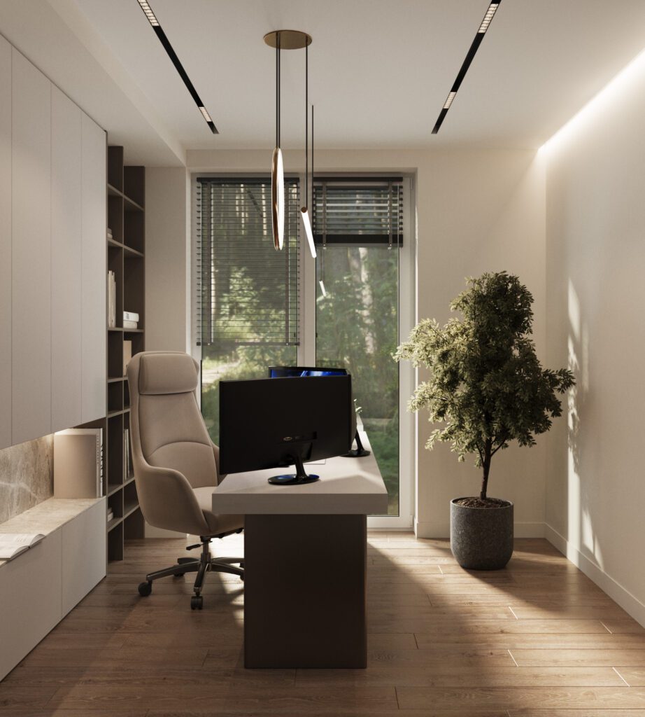 Locuință contemporană cu living open space, birou și dormitor matrimonial spațios.